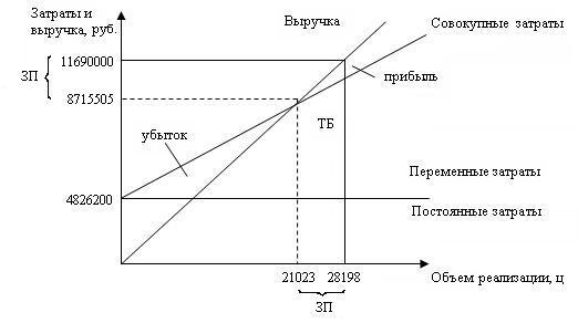 Точка безубыточности достигается при объеме реализации 10937 ц и выручке 9760835 руб. Фактический объем реализации – 26362 ц, выручка – 23527000. Запас прочности достаточно большой, т.е. предприятие может безопасно снижать объем реализации.