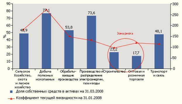 Речь идет, прежде всего, прежде всего, о торговых и строительных предприятиях, а именно эти отрасли стали одними из самых кредитоемких в 2005-2007 годах. Сегодня эти два сектора экономики характеризуются одними из наиболее низких уровней самофинансирования (доля собственных средств в активах) и текущей ликвидности (см. график 1). По данным мониторинга, проведенного Банком России, в конце первого квартала 2008 г. 82,3% активов предприятий оптовой и розничной торговли приходилось на привлеченные средства.