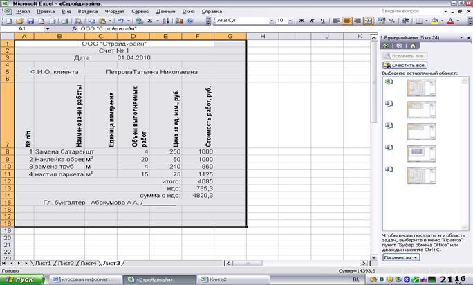 11. На основе исходной таблицы, представленной на рис. 3, заполним форму данными из таблицы «Расчет стоимости». Заполненный счет на оплату работ представлен на рис. 6.