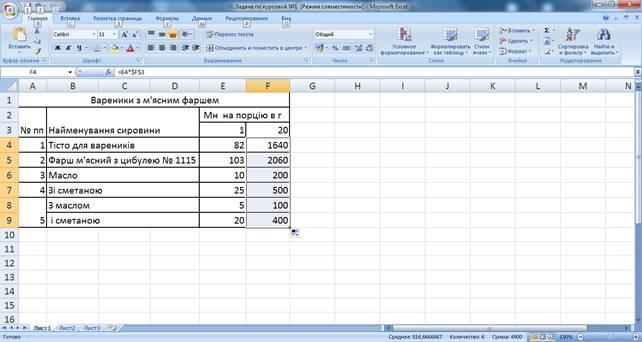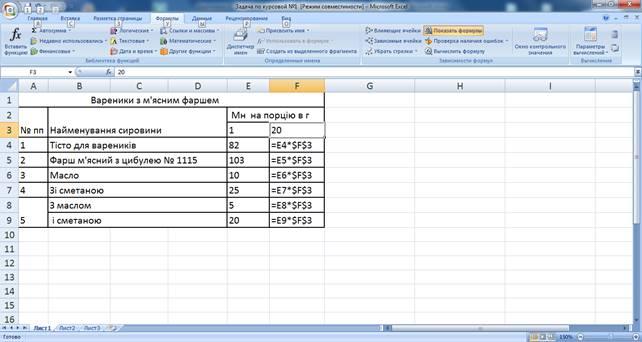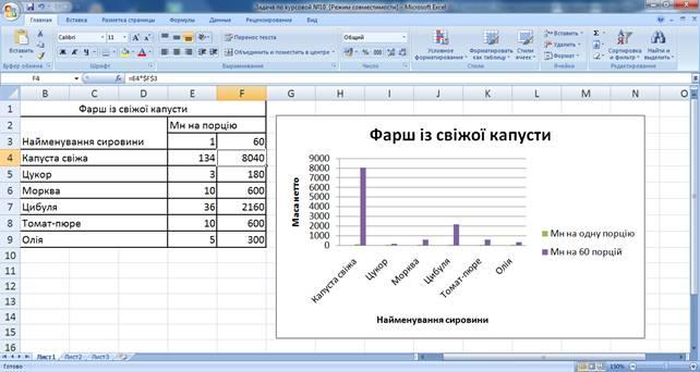 У рецепті вареників зі свіжою капустою дивимося скільки фаршу потрібно на одну порцію і множимо на 60 порцій. Формула аналогічна задачі №1 (див. рис. 2.25).