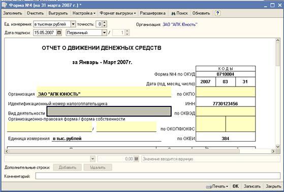 Годовой отчетная информация о движении денежных средств в ЗАО «АПК Юность» формируется в Отчете о движении денежных средств, который заполняется на основании данных главной книги.