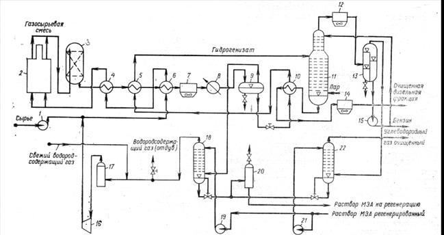 с применением катализатора (обычно алюмокобальтмолибденовый или алюмоникельмолибденовый).Гидроочистке (или гидрооблагораживанию) может подвергаться различное сырье, получаемое как при первичной перегонке нефти, так и при термокаталитических процессах, от газа до масел и парафина. Наибольшее применение гидроочистка имеет для обессеривания сырья каталитического риформинга, а также для получения реактивного и малосернистого дизельного топлива из сернистых и высокосернистых нефтей. При гидроочистке происходит частичная деструкция в основном сероорганических и частично кислород- и азотсодержащих соединений.Продукты разложения насыщаются водородом с образованием сероводорода, воды, аммиака и предельных или ароматических углеводородов. Удаление гетероатомов происходит в результате разрыва связей C–S, C–N и C–O и насыщения образующихся осколков водородом. При этом сера, азот и кислород выделяется соответственно в виде H2