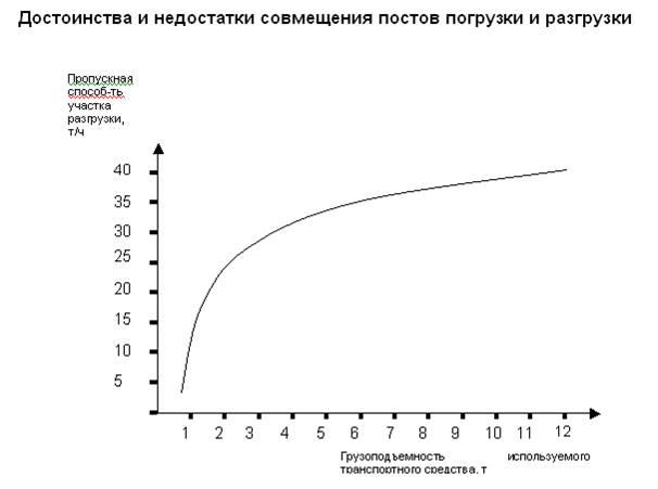Очевидно, что при увеличении числа постов очередь, т.е. значение сокращается. Оптимальным будет такое количество постов Пропускная способность погрузочно-разгрузочной зоны зависит не только от числа постов, но и от грузоподъемности поступающего транспорта. Проведенные методом теории массового обслуживания расчеты показывают, что при заданном числе постов, например 4, и при заданном значении очереди на разгрузку, например не более одной машины, количество обрабатываемых на участке грузов прямо пропорционально грузоподъемности обслуживаемого транспорта. Характер зависимости имеет форму кривой, представленной на рис.2.