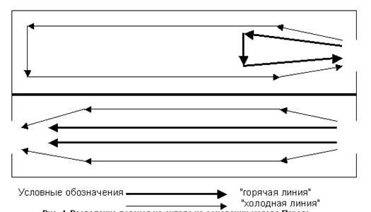Как правило, часто отпускаемые товары составляют лишь небольшую часть ассортимента, и располагать их необходимо в удобных, максимально приближенных к зонам отпуска местах, вдоль так называемых "горячих" линий (рис. 4). Товары, требующиеся реже, отодвигают на "второй план" и размещают вдоль "холодных" линий. Вдоль "горячих" линий могут рас располагаться также крупногабаритные товары и товары, хранящиеся без тары, так как их перемещение связано со значительными трудностями.