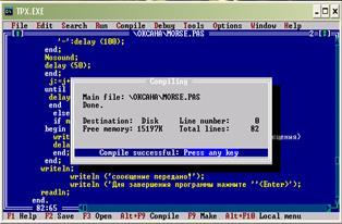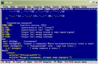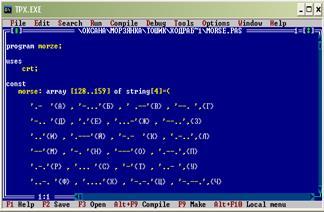 В верхней части окна редактирования TurboPascal размещается меню, состоящее из опций: File (управление файлами), Edit (редактирование текста программы), Search (поиск и замена текста), Run (выполнение программы в различных режимах), Compile (компиляция, создание exe-файла), Debug (отладка программы), Tools (отладочные команды сообщения), Options (настройка среды программирования), Window (управление окнами), Help (доступ к встроенной справочной системе). Команды меню можно выбирать с помощью клавиатуры (F10 и клавиши управления курсором) либо мышью (щелчок по нужной опции меню).