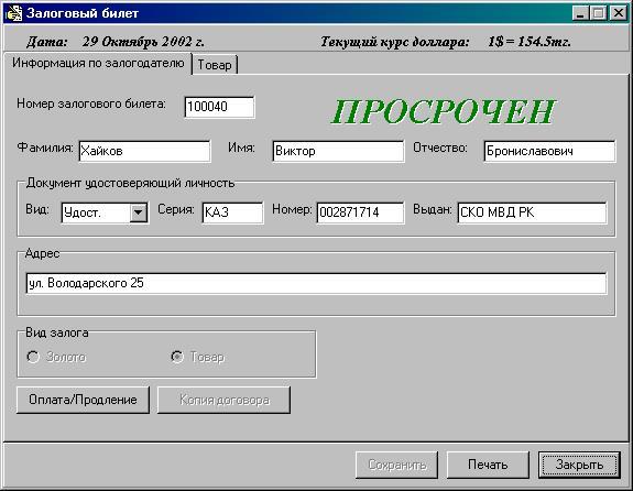 № залогового билета