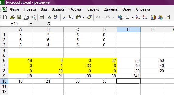 4. В ячейку E9 выводиться оптимальное решение