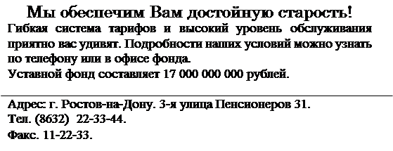 · На этапе введения фирма должна потратить большие средства на объемные рекламные объявления, содержащие в себе информацию о том, что такое негосударственный пенсионный фонд, для чего он нужен, условия внесения взносов и получения пенсии. Также крайне необходимо создать образ компании (название, фирменный знак, девиз) и сообщить адрес фирмы (или адреса филиалов). Фирма также может сообщить номер своей лицензии и размер уставного капитала для повышения доверия к фирме. Пример такого объявления я составил и привожу на следующей странице.
