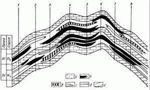 Схема распространения залежей нефти в среднем карбоне Бухарского месторождения