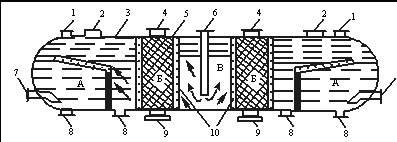 Водонефтяная эмульсия I в установке по подготовке сточных вод закрытого типа, поступающая с промысла, смешивается с горячей пластовой водой VII, выводимой из отстойников или подогревателей-деэмульсаторов установки подготовки нефти и содержащей реагент-деэмульгатор, проходит каплеобразователь 1 и поступает в резервуар-отстойник с жидкостным гидрофильным фильтром 2, в котором осуществляется предварительный сброс воды. Резервуар-отстойник с жидкостным гидрофильным фильтром выполнен на основе типового вертикального резервуара и имеет сифонное устройство, обеспечивающее поддержание заданного слоя воды под слоем нефти. Водонефтяная эмульсия, изменившая свой тип с обратного на прямой в результате смешения с горячей водой с реагентом-деэмульгатором и турбулентного перемешивания в каплеобразователе, поступает в резервуар-отстойник 2 под слой воды через распределитель. Поднимаясь через жидкостный гидрофильный фильтр (слой воды) капли нефти освобождаются от эмульсионной воды. Таким образом происходит предварительное обезвоживание нефти и предварительно обезвоженная нефть II выводится с верхней части резервуара-отстойника 2. Отделившаяся на этой стадии сточная вода III перетекает в резервуар-отстойник с гидрофобным жидкостным фильтром 3. Этот резервуар-отстойник также выполнен на основе типового вертикального резервуара и имеет сифонное устройство, обеспечивающее поддержание заданного слоя нефти над слоем воды. Сточная вода вводится через лучевой перфорированный распределитель в слой нефти (жидкостный гидрофобный фильтр) и, опускаясь вниз, освобождается от капелек нефти. Уловленная нефть V (ловушечная нефть) собирается в камере, выводится сверху резервуара-отстойника и направляется на установку подготовки нефти. На границе раздела нефть—вода может образовываться слой неразрушаемой эмульсии IV, которая периодически выводится и направляется также на установку подготовки нефти. Вода, прошедшая через слой нефти и освободившаяся от основной части капельной нефти, подвергается еще и отстою в слое воды. Все эти операции обеспечивают достаточно глубокую очистку пластовой воды от капельной нефти, и очищенная вода VI, пройдя емкость 4, насосом 5 закачивается в поглощающие или нагнетательные скважины. Основным аппаратом установок по подготовке сточных вод закрытого типа на принципе фильтрации является коалесцирующий фильтр-отстойник типа ФЖ-2973 , разработанный институтом БашНИПИнефть. Сточная вода предварительно подвергается отстою в горизонтальном отстойнике, а затем через патрубок ввода 6 поступает в приемный отсек В фильтра-отстойника, расположенный в средней части корпуса 3. Из приемного отсека сточная вода через перфорированные перегородки 10 поступает в фильтрационные отсеки Б. Фильтрационные отсеки заполнены коалесцирующим фильтром 5, в качестве которого применяют гранулированный полиэтилен с размером гранул 4—5 мм. Полиэтилен обладает гидрофобным свойством: нефть смачивает его, а вода нет. Поэтому капли нефти, задерживаясь на поверхности гранул, сливаются (коалесцируют) и выходят из фильтрационных отсеков Б в отстойные отсеки А в укрупненном виде. По этой причине в отстойных отсеках происходит быстрое расслоение воды и капелек нефти и нефть выводится сверху через патрубки вывода нефти 1, а очищенная вода — 