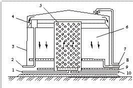 . Газонасыщенная вода через патрубок ввода 1 вводится в нижнюю часть флотационной зоны с помощью перфорированного распределителя. Сточная вода поднимается во флотационной зоне со скоростью, обеспечивающей длительность пребывания воды во флотационной зоне около 20 мин. Выделяющиеся пузырьки газа, поднимаясь зверх, встречают на своем пути дисперсные частицы, распределенные в воде. Дисперсные частицы, которые плохо смачиваются водой (капельки нефти), захватываются пузырьками и флотируются на по-зерхность, образуя там слой пены. Уловленная нефть собирается в юльцевой желоб 4 для сбора нефти и выводится через патрубок 2. Вода из флотационной зоны 5 перетекает в отстойную зону 6, расположенную в кольцевом пространстве между корпусом 3 резервуара и флотационной зоной, где медленно опускается вниз. Дисперсные частицы, которые хорошо смачиваются водой, не захватываются пузырьками газа во флотационной зоне, а под действием силы тяжести осаждаются вниз во флотационной и отстойной зонах, откуда осадок выводится через соответствующие перфорированные трубы и патрубки 9 и 10. Очищенная вода выводится через кольцевой перфорированный коллектор и патрубок 8. Резервуар-флотатор герметизирован, поэтому выделяющийся из воды газ выводится сверху резервуара через патрубок 7. Содержание примесей (мг/л) в сточной воде, поступающей в резервуар-флотатор на очистку, должно быть: нефти — 300, механических примесей — до 300. Остаточное содержание в очищенной воде, выходящей из резервуара-флотатора, составляет (мг/л): нефти — 4—30, механических примесей — 10—30.