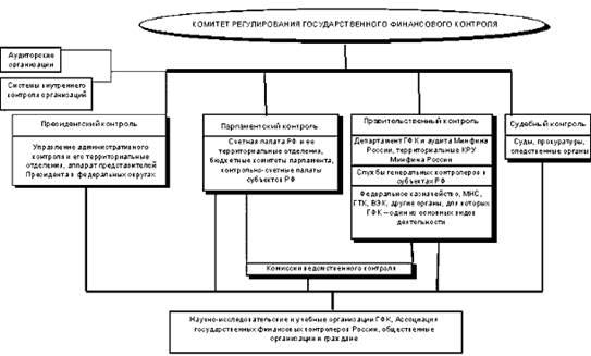 Функционирующие в настоящее время в России органы ГФК инкорпорированы в систему государственной власти в соответствии с необходимостью соблюдения баланса полномочий ее ветвей. В то же время, как говорилось и обосновывалось выше, в настоящее время существует система ГФК, можно сказать, с большой натяжкой. И хотя деятельность отдельных органов ГФК (как парламентского, так и президентского, и правительственного контроля) в отрыве от общей картины контроля в стране и их, к сожалению, весьма незначительное, по крайней мере, фактически, влияние на происходящие перестроечные процессы можно было бы оценивать положительно (ведь при любом раскладе хоть что-то все равно ими делается), в общем и целом они не представляют систему. Ни у кого не вызовет сомнений то, что система как таковая может функционировать слаженно, без каких бы то ни было коллизий, столкновений интересов только в случае четкого разграничения сфер деятельности и конкретных задач органов ГФК. К тому же количество органов должно быть адекватно целям и структуре системы. Как свидетельствует практика, многочисленные, но несистемно связанные государственные контролирующие органы оказывают незначительное влияние на состояние порядка и дисциплины в стране, что в целом подрывает саму суть, сам настрой социально-экономических преобразований. При этом ситуацию усугубляет отсутствие скоординированности в деятельности контрольных органов и слаженности в работе. Их функции пересекаются, ответственность размывается. Происходит явное и неявное дублирование и параллелизм и, как следствие этого, снижение действенности и нерациональное использование весьма ограниченных ресурсов. Серьезным препятствием для повышения роли государства в успешном осуществлении экономических реформ является в числе прочего и не совсем оптимальная, а точнее говоря, громоздкая структура ГФК, обусловливающая разобщенный и недостаточный контроль за поступлением, расходованием и сохранностью государственных средств. Эффективность ГФК в таких условиях трудно достижима, что способствует расширению криминальных проявлений во всех сферах экономики, росту дефицита бюджета, государственного долга, стало серьезным препятствием на пути экономической стабилизации и оздоровления финансовой системы. Иными словами, успех реформирования ГФК, действенность его системы напрямую зависят от успешного решения организационно-структурных вопросов. Проанализируем основные вопросы предлагаемой нами структуры системы органов ГФК. Следует отметить, что данные вопросы мы рассматриваем как вопросы организационного обеспечения формирования эффективной системы ГФК.