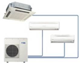 являются разновидностью сплит систем. Их отличие в том, что к одному внешнему блоку подключается не один, а несколько внутренних блоков — обычно от 2 до 4 - 5 штук (каждый внутренний блок управляется индивидуальным пультом управления). При этом внутренние блоки могут быть не только разной мощности (обычно от 2 до 5 кВт), но и разных типов. Такое конструктивное решение позволяет экономить место на наружной стене здания и не так сильно портить внешний вид наружными блоками. При этом, вопреки распространенному мнению, замена нескольких сплит систем на одну мульти сплит систему не приводит к выигрышу в цене, поскольку стоимость оборудования примерно такая же, а трудоемкость и стоимость монтажа в 1,5 — 2 раза выше из-за более длинных коммуникаций. Кроме этого, при выходе из строя внешнего блока мульти сплит-системы перестают работать все внутренние блоки. Поэтому мульти сплит системы обычно используют только при невозможности размещения нескольких внешних блоков на наружной стене здания.