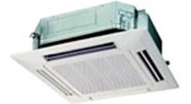 ), также как и для канального кондиционера, необходим подвесной потолок. Однако в отличие от канальных сплит систем, кондиционеры кассетного типа распределяют охлажденный воздух через нижнюю часть блока. Нижняя часть кассетной сплит системы имеет размер стандартной потолочной плитки — 600 × 600 мм, а при большой мощности вдвое больше — 1200 × 600 мм и закрывается декоративной решеткой с распределительными жалюзи. Основное достоинство кассетных кондиционеров — незаметность, поскольку видна только декоративная решетка. Еще одно его преимущество — равномерное распределение воздушного потока по четырем направлениям, что позволяет использовать всего один кондиционер кассетного типа для охлаждения большого помещения (при использовании настенных сплит-систем для достижения аналогичного эффекта пришлось бы использовать 2 — 3 кондиционера меньшей мощности).