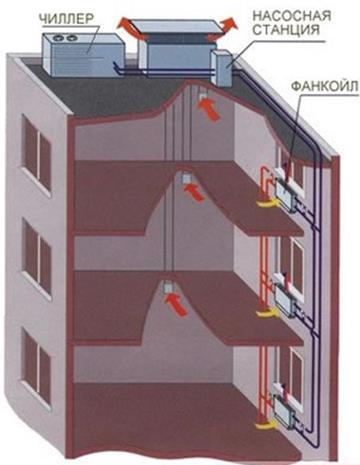 -это холодильная машина для охлаждения или подогрева жидкости. Жидкость, поступаемая из чиллера, проходит через теплообменник фанкойла и забирает тепло из помещения. Поэтому данное оборудование наиболее актуально использовать для кондиционирования и вентиляции зданий, чем использовать обычные кондиционеры.