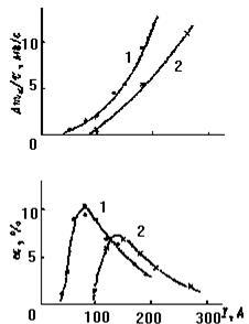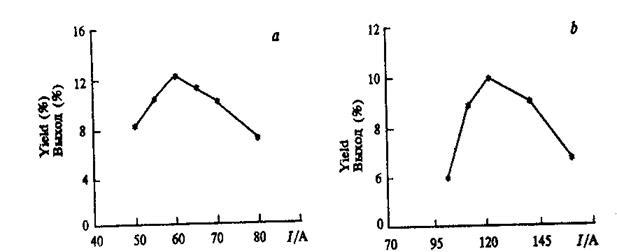 Рис.22. Зависимость выхода фуллеренов от тока дуги: a-постоянный ток ;b-переменный ток.