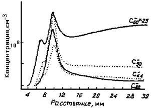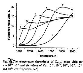 при температуре 2100 К. Повышение температуры на 200 К приводило к существенному снижению концентрации С60
