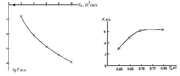 Авторами также проверялось влияние заряженных частиц на процесс образования фуллеренов [22]. В эксперименте (рис.19) углерод испарялся термически с наружной стороны дна графитового стакана, изнутри подогреваемого дугой до 3000 К. Испаряемый материал собирался на охлаждаемый сборник (5) при давлении гелия 70 торр. Содержание фуллеренов в саже было минимальным α~0,1%. При дополнительном зажигании в парах между дном стакана и сборником тлеющего разряда I=10мА количество фуллеренов в саже не изменялось при отрицательном дне стакана (катод) и увеличивался до α~(2¸3)% при положительном стакане. Авторы объясняют эффект следующим : 1)-ионы углерода в его парах способствуют образованию фуллеренов; 2)-при отрицательном источнике паров ионы снова возвращаются на него в электрическом поле катодного падения и их доля вблизи сборника слишком мала.