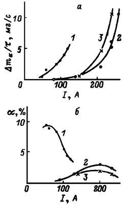 /t (a) и содержания фуллеренов в саже a (б) от тока дуги. Dc