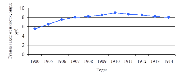 Кредитная история России началась в 1769 г., когда Екатерина II сделала первый заем в Голландии. За последующие два с половиной столетия Российская империя заняла на рынке примерно 15 млрд. руб. Большая часть этих средств накануне революции была погашена. К этому моменту старейшими займами в составе русского государственного долга оставались шестипроцентные займы 1917-18гг. Их нарицательный капитал составлял 93 миллиона рублей, а непогашенная часть к 1 января 1913 года равнялась 38 миллионам рублей. На графике отражена динамика государственного долга Российской империи в начале XX века. Сумма задолженности возросла в период русско-японской войны и революции, а затем стабилизировалась.