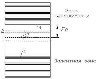 Рис 5. Уровни ловушек в запрещенной зоне диэлектрика 1-«глубокие» ловушки, 2 - «мелкие» ловушки, 3 - носители заряда на ловушке, 4 - свободный электрон в зоне проводимости, 5 -свободная дырка в валентной зоне