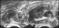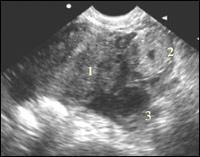 | Эхокартина внематочной беременности Матка(1)Прерванная ВБ(2)Желтое тело(3)