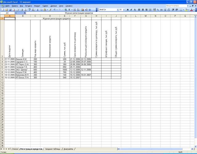На рабочем листе «Регистрация кредитов» MS Excel создать таблицу журнала регистрации кредитов.