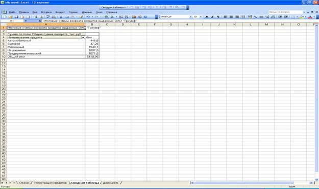 MS Excel создать таблицу, в которой будут суммы выплат по отдельным видам кредитов.