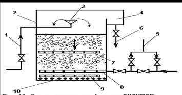 Рис 3 Схема затопленного фильтра ОКСИПР:1-трубопровод для подачи воды на очитску;2-корупс фильтра;3-распределительная воронка;4-карман для отведения промывной воды;5-сифон;6-трубопровод для отведения промывной воды;7-верхняя система распределения воздуха;8-распределительная система для сбора очищенной и подачи промывной воды;9-нижняя система распределения воздуха;10-подстилающий слой гравия.