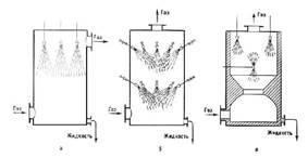На рис. 4 показаны некоторые типы распыливающих абсорберов, выполненных в виде полых колонн. Газ в них движется обычно снизу вверх, а жидкость подается через расположенные в верхней части колонны распылители с направлением факела распыла сверху вниз (рис 4,а) или под некоторым углом к горизонтальной плоскости (рис 4,б). Во многих случаях распылители располагают в несколько ярусов. Применяют также комбинированную установку распылителей часть факелом вверх, а часть – факелом вниз (рис 5).