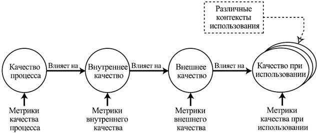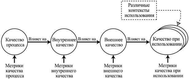Для всех этих аспектов качества введены метрики, позволяющие оценить их. Кроме того, для создания добротного ПО существует качество технологических процессов его разработки. Взаимоотношения между этими аспектами качества по схеме, принятой ИСО 9126, показано на рис. 2.