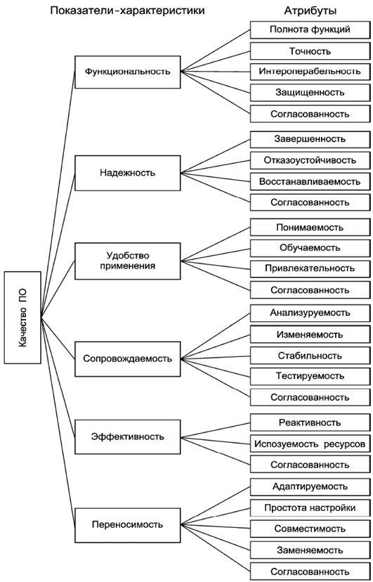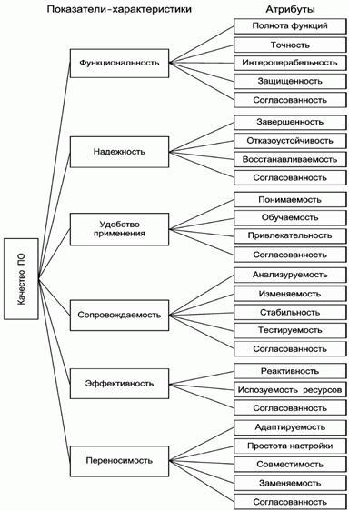 Рис. 1. Характеристики и атрибуты качества ПО по ИСО 9126