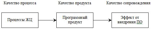 Качество ПО - это относительное понятие, которое имеет смысл только при учете реальных условий его применения, поэтому требования, предъявляемые к качеству, ставятся в соответствии с условиями и конкретной областью их применения. Оно характеризуется тремя аспектами: качество программного продукта, качество процессов ЖЦ и качество сопровождения или внедрения (рис 1).