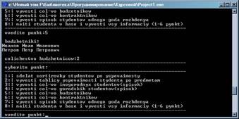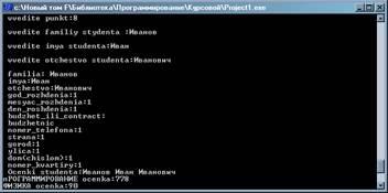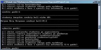 cout<<"\n 8:| naiti studenta v base i vyvesti vsy informaciy (1-6 pynkt)";