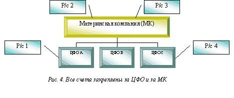 1)Все расчетные счета и кассы считаются собственностью МК, которая осуществляет оперативное управление всеми денежными потоками, принимает решения о перебросках денег между счетами, конвертациях, использовании дополнительных финансовых инструментов. Как следствие, все остатки по ним включаются в баланс МК. Кроме того, МК может взимать определенные комиссионные с каждого ЦФО за процессинг платежей.
