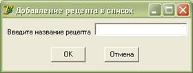 При выборе подпункта “Список рецептов” на форму 2-Список рецептов будет выведен список рецептов с их кодами и названиями в виде таблицы. На форме есть кнопки “Добавить ”, “Удалить”, “Печать” и “Выход”. При нажатии на кнопку “Добавить” появится форма 3-Добавление рецепта в список. Эта форма содержит поле для ввода названия рецепта и кнопки “ОК” и “Отмена”. При нажатии на ОК рецепт добавляется в список, при нажатии на Отмена происходит возвращение на форму 2. При нажатии на кнопку “Удалить” происходит удаление рецепта из списка. Эта форма содержит две кнопки “ОК” и “Отмена”. Кнопка “Печать” позволяет распечатать список рецептов для отчетности. Кнопка “Выход” производит выход в главное меню. На форме также находится поле для подсчета общего числа рецептов.
