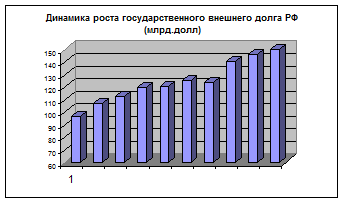 В этой главе я также хотел затронуть внешний государственный долг РФ, так как сейчас обслуживанию долга отдается большое предпочтение и значительная доля бюджета идет на погашение. Как уже говорилось ранее в 1985 г. внешний долг составлял 26 млрд.долл, то в 1998г. внешняя задолжность составила 52,4 млрд.долл., а к 2001 году размер государственного долга составил 150 млрд.долл. Как видно внешний долг растет довольно прогрессивными темпами. Особенный скачек роста государственного долга был в 1998 году после финансового кризиса, когда на поддержание экономики Россия заняла 17 млрд.долл. Основным кредитором России выступает Германия.
