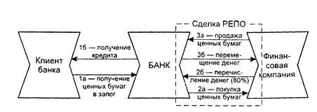 Банк, осуществляя операцию по кредитованию клиента, получает ценные бумаги в залог (1а). Как уже упоминалось, Репо — финансовая операция, состоящая из двух частей. Одна из участвующих сторон (в данном случае банк) продает ценные бумаги другой стороне (2а; б) и в то же время берет на себя обязательство выкупить указанные ценные бумаги другой стороне в определенную дату или по требованию второй стороны (в данном случае финансовой компании) — (За, б). Обязательству на обратную покупку соответствует обязательство на обратную продажу, которое принимает на себя вторая сторона — финансовая компания. Обратная покупка ценных бумаг осуществляется по цене, отличной от цены первоначальной продажи. Разница между ценами и составляет тот доход, который должна получить сторона, выступившая в качестве покупателя в первой части Репо (в данном случае финансовая компания). Доход продавца денежных средств определяется величиной ставки Репо, что позволяет сопоставить эффективность проведения операций Репо с другими финансовыми операциями.