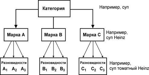 Следует помнить о необходимости строгого разграничения таких понятий, как категория, марки и разновидности товаров (рис.1). Категория (или сфера товара) подразделяется на марки, которые, в свою очередь, могут подразделяться на разновидности, на основе их особенностей, вариаций или каких-либо других специфических характеристик, например запаха, формулы и т.п. Так, например, томатный суп Heinz