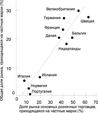 В Европе прослеживаться тесная взаимосвязь между использованием крупными супермаркетами собственных торговых марок и степенью концентрации предприятий розничной торговли. Там где продажа продуктов питания сосредоточена в нескольких крупных супермаркетах, процентное соотношение частных марок к общему количеству марок довольно высоко.