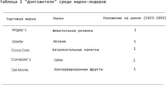 При управлении марками необходим постоянный поиск способов реализации всего потенциала марки. Показателем высокого потенциала марки может служить ее лидерство на рынке в течение длительного времени. В табл. 1.перечисленны пять марок, которые удерживали первенство на протяжении 50 лет. Для компаний, создавших эти марки, постоянное совершенствование их функциональных и эмоциональных достоинств настолько важно, что потребители и по сей день предпочитают их товары продукции конкурентов.