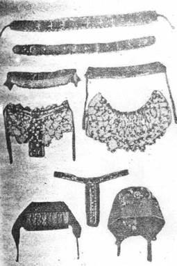Рис. 6. «Чехры», поднизь, поднизка; ожерелье в клетку с «языком»; ожерелье в клетку; подшейный «язык»; позатылень; парчовый «сборник».