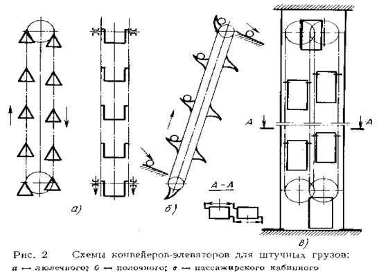 Різновидом ковшових елеваторів є підйомники безперервної дії для штучних вантажів. У цих пристроях до тягових ланцюгів закріплюються не ковші, а шарнірно підвішені площадки-колиски (мал. 2, а), що дозволяє не тільки піднімати, але й опускати вантаж. Такі елеватори називають люльковими. При твердому кріпленні полиць до тягових ланцюгів елеватор виконують похилим (мал. 2, б) і використовують переважно для підйому різних штучних вантажів, що подаються самопливом на полки і самопливом скочуються з них. Такі елеватори використовують в основному як вантажно-розвантажувальні пристрої. Елеватори застосовують також як пасажирські підйомники безперервної дії (мал. 2, в). Кабіни для пасажирів підвішують шарнірно до двох ланцюгів, що забезпечує їх вільне проходження через верхні і нижні зірочки. Щоб не робити зірочки занадто великого діаметра (0,5 Dзв