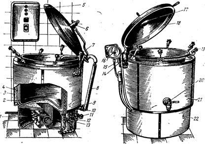 Сверху варочный сосуд закрывается откидной на шарнире двустенной крышкой 18, между двойными стенками которой находится воздушная прослойка. В пазу нижней части крышки имеется прокладка из термостойкой пищевой резины, с помощью которой обеспечивается плотность прилегания. ее к котлу, когда завертываются прижимные болты 19. Крышка уравновешивается пружинным противовесом 8, позволяющим фиксировать ее при открывании в любом положении.
