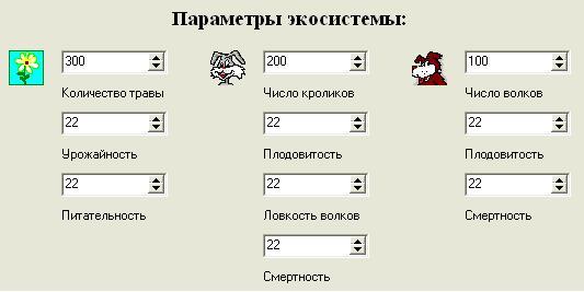 Т.о. было выявлено следующее, изменять параметры можно, но они должны быть обязательно одинаковы и существуют границы изменения параметров (от 3 до 22). Т.е. плодовитость = естественной смертности кроликов = ловкость волков = естественной смертности волков = урожайности травы = питательность травы. Причем чем выше численное значение параметра, тем быстрее экосистема возвращается в стабильное состояние и тем больше её прибыльность.