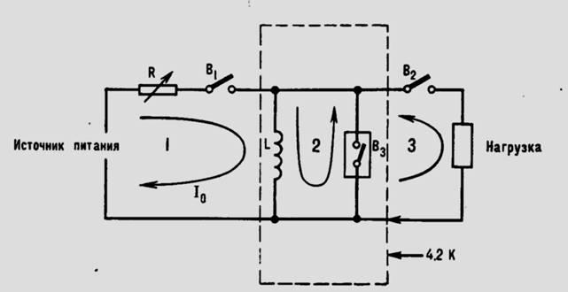 На рис. 1 показана схема индуктивного накопителя энергии со сверхпроводящей катушкой. Сверхпроводящая катушка L заряжается при замкнутом выключателе B1