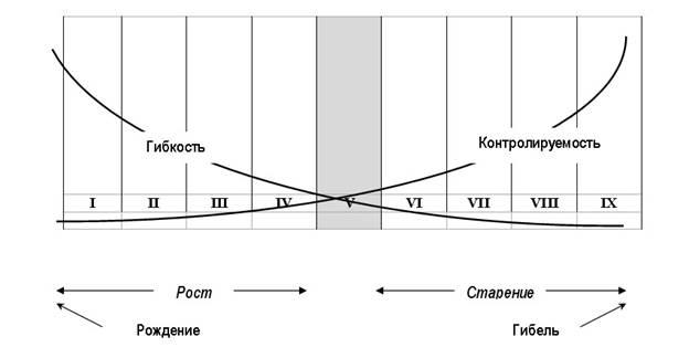 В основе выделения стадий (фаз) жизненного цикла организации А. Адизеса — соотношение двух параметров деятельности организации — гибкости и контролируемости. Гибкость — это способность организации адаптироваться к внешним и внутренним изменениям, а также способность руководства действовать вне жестких рамок, правил и норм. Контролируемость — это степень регламентации деятельности организации и ее членов, а также жесткости механизмов координации и контроля.
