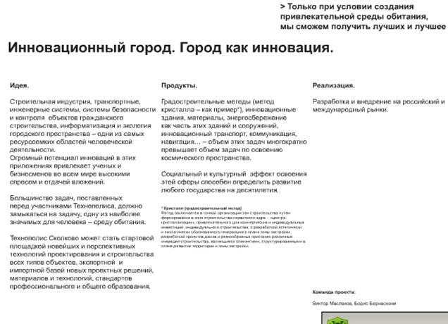 Сколково — это проект, цель которого — создание системы воспроизводства инноваций и рождения продуктов с высокой добавленной стоимостью, конкурентоспособных на мировом рынке. Стране не нужен ещё один «закрытый посёлок», куда можно было бы проходить только по спецпропускам. Есть идея воспроизвести систему, схожую с той, которая способствовала созданию новых технологий в конце 20-го века в США, Корее, Израиле, Финляндии. Детали, конкретика проекта до сих пор находятся в разработке. Чтобы добиться ожидаемого результата, мы хотим создать наиболее благоприятные условия для привлечения предприятий и организаций, учёных и рабочих в этот инноград.