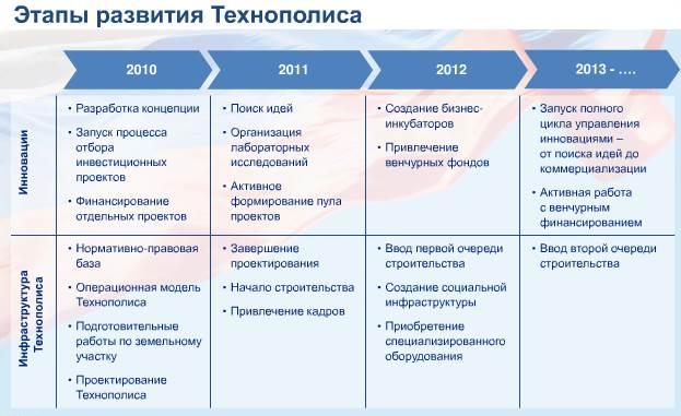 Владислав Сурков, отвечая в телеэфире на вопрос о том, в какие сроки может быть создан новый комплекс, отметил, что непосредственно строительные работы могут занять от трёх до семи лет. По его словам, «сначала будет строиться ядро города, его центральная часть, потом оно будет разрастаться уже в значительной степени самостоятельно, без какого-то участия государства». Сурков отметил, что государство должно будет «в какой-то момент отойти от этого всего» и дать ему «развиваться самостоятельно». Что касается формирования научной среды, то она может сформироваться, по мнению замглавы президентской администрации, за 10-15 лет: «Это то время, за которое может возникнуть цепная реакция, которую трудно будет остановить, и возникнет волна изобретений российского происхождения».