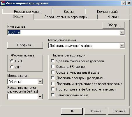 Большие по объему архивные файлы могут быть размещены на нескольких дисках (томах). Такие архивы называются многотомными. Том – это составная часть многотомного архива. Создавая архив из нескольких частей, можно записать его части на несколько дискет.